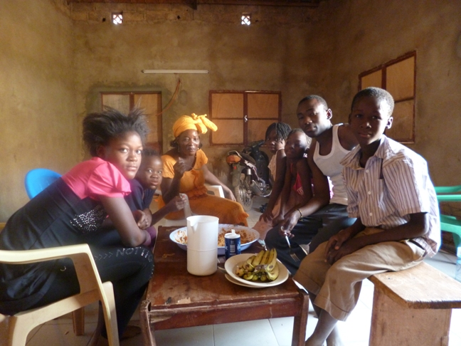 Steinskulptur Laongo 25.02.2013 ouagadagabougoudougououagadagabougoudougou, das ist kein Zitat von Fred Feuerstein, sondern so oder so aehnlich heisst die Hauptstadt Burkina Fasos. Der Einfachheit halber wird sie nur Ouaga genannt. Vor vielen, vielen Jahren, als sich das Land noch Obervolta nannte, hat einmal ein Minister, der seinen Namen nicht in meinem Blog lesen will, sehr viele Vokale gekauft und seitdem tragen die meisten Orte in Burkina Faso wunderschoene Namen. Es sind uebrigens noch Restbestaende vorhanden. Wer Bedarf hat, melde sich bei mir, ich kann dann den Kontakt herstellen. Ouaga liegt zwar etwa 1000 Kilometer vom Meer entfernt, doch ich wagte mich ans Surfen. Via Couchsurfing strandete ich in dem wohlklingenden Stadtteil Bogodogo bei Azara und ihrer Familie. Obwohl in Ouaga viele Auslaender leben (Botschaften, NGOs und andere Organisationen) verirrt sich von denen nie einer nach Bogodogo, was jenseits des Flughafens, welcher sich mitten in der Stadt breit macht, liegt. Meine Familie moechte ich zu der in Africa nahezu nicht vorhandenen Mittelschicht zaehlen. Das Haus mit fuenf Zimmerm und Kueche ist fuer africanische Verhaeltnisse grosszuegig, ich habe ein eigenes Zimmer, in dem sich nichts befindet ausser einer Matratze am Boden. Perfekt. Moskitonetz habe ich selbst und mehr brauche ich nicht. Das uebrige Mobilar des Hauses beschraenkt sich auf einen Fernseher, mehrer PLastikstuehle, eine Holzbank und einen kleinen niederen Wohnzimmertisch. Ein Bad ist nicht vorhanden, dafuer gibt es im Hof einen zentralen Wasserhahn sowie eine Eimerdusche cum Latrine. Azara hat drei eigene Kinder im Alter von sechs Monaten bis zu vierzehn Jahren dazu lebt noch eine Nichte im Haus, die sie aufgenommen hat, damit sie zur Schule gehen kann, da ihre Familie das Geld nicht aufbringen kann oder will. Fuer einen kleinen Unkostenbeitrag darf ich bei ihrer Familie mitessen. Azara beherrscht die africanische Kochkunst hervorragend. Einmal koche ich fuer die Familie Spaghetti Bolognese, wobei ich den Anfaengerfehler begehe und fuer sechs Esser plane. In Africa wird immer fuer unvorhergesehene Gaeste mitgekocht und jeder ist herzlich eingeladen mitzuessen. Schlussendlich beteiligen sich elf Mitesser an der Mahlzeit, wobei knapp die Haelfte mit den Haenden ist (Der Traum meiner Neffen).