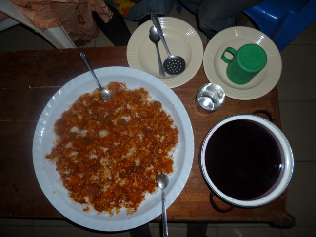 Africanisches Mahl mit riz sauce und jus de Bissap (rechts im Topf)