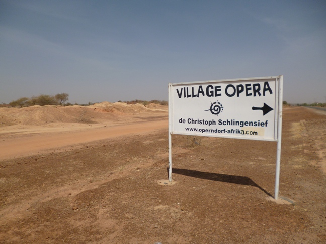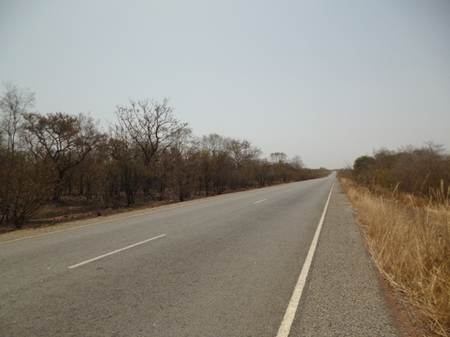 Mittagshitze (schwer zu erkennen auf dem Foto) auf der Nationalstrasse N6. Im Wald entlang der Strasse soll es Banditen geben, ich konnte jedoch keine sichten. 25.02.2013 halbzeitDa sich kein Unparteiischer in der Naehe befand, entschied ich selbst, dass nun Halbzeit sei. Zeitlich passte das ganz gut und Ouagadougou klingt einfach cool. Ausserdem ist dies der oestlichste Punkt meiner Reise. Von Banjul aus war ich mal Richtung Norden und mal Richtung Sueden jedoch immer gen Osten geradelt. Von nun an fahre ich zurueck Richtung Westen auf einer suedlicheren Route als auf dem Hinweg, wobei ich auf Rueckenwind hoffe. Bis Ouaga habe ich 3200 Kilometer zurueckgelegt, ohne einen PLatten gehabt zu haben oder andere schwerwiegende technische Probleme ausser dem Ausfall des Fahradlichtes, was angesichts der bewaeltigten nicht asphaltierten Teilstrecken (Ueber Geroellfelder und querbeet durch die Dornensavanne) schon ein kleines Wunder ist. Ausser der glimpflich verlaufenden Malaria tropica war ich nicht ernstlich krank abgesehen von zwei kleinen Erkaeltungen (Viele Africaner sind im Winter verschnupft) und zwei schlecht verdaulichen Mahlzeiten. Von Ouaga aus habe ich noch einen Abstecher in die Naehe von Ziniare zum noch nicht vollendeten Operndorf von Christoph Schlingensief und zu den Steinskulpturen von Laongo, was strenggenommen der oestlichste Punkt meiner Reise war, gemacht. Kunstgeschichtlich interessanterwar das zu meinem Hotel in Ziniare gehoerige Restaurant Bar Dancing. Fuer die Bestuhlung des Etablissements waren mindestens zwei Busse ausgeschlachtet worden, so dass man nun pro Tisch in Zweierreihe in vier verschiedenen Richtungen Bus fahren konnte. Lange sinnierte ich ueber den Grund fuer die tiefer gelegte Tanzflaeche, bis ich realisierte, dass aus dem Pool das Wasser verdampft war.