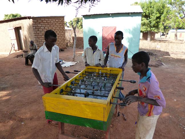 Dorfjugend beim Tischfussball in Tienfala, hinten links mein Zimmer