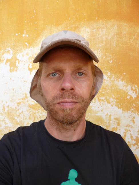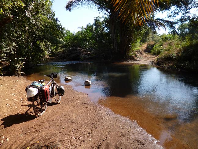 Africareisender mit modernem Tropenhelm 06.01.2013 ein langer tag, der zur nacht wird - teil 1Es folgt ein stark gekuerzter Bericht jenes Tages. Zum bevorstehenden Streckenabschnitt von Segou im Senegal nach Mali-Yemberem, einem abgelegenen Bergdorf im Fouta Djalon Gebirge in Guinea, habe ich sehr unterschiedliche Informationen. Wie sich herausstellen wird, ist keine davon ganz richtig. Die Senegalesen empfehlen mir einen direkten Weg, der nicht von Fahrzeugen bewaeltigt werden kann und an dessen Ende man zu Fuss eine steile Klippe hinaufmuesse. Ob ich mein Fahrrad auf dem Kopf tragen koenne? Eine leichte Uebung, doch ich verneine. Es gebe am Rande der Klippe Traeger, die ich gegen Bezahlung mein Fahrrad und das restliche Gepaeck hinauftragen lassen koenne. Warum nicht? Auch verstehe ich mit meinem rudimentaeren Franzoesisch noch etwas von einer langen Leiter, die ich hinaufklettern, und von einem tiefen Abgrund, ueber den ich irgendwie ohne Gelaender balancieren muesse. Aber nur mit dem Fahrrad auf dem Kopf... Wozu bin ich in Africa? wenn nicht zu einem kleinen Abenteuer wie diesem? Ich starte frueh um sieben Uhr kurz nach Beginn der Helligkeit. Die so genannte Strasse zur Grenze existiert nicht, stattdessen habe ich eine schmale Schneise in der Vegetation mit einem Geroellfeld vor mir bei stramm ansteigendem Weg. An Radfahren ist nicht zu denken. Ich wuchte das Fahrrad bergauf, waehrend ich fluche. Viele Stellen sind so steil, dass ich an die Grenze des Moeglichen stosse. Fuer die ersten anderthalb Kilometer brauche ich fast eine Stunde; Laufen waere schneller gewesen... Nach zwoelf Kilometern erreiche ich eine ueber die Strasse spannende Schnur und ein Dorf, das ausschliesslich aus Bambus besteht. Wo ist der Grenzposten? Ein laenglicher Schuppen entpuppt sich als solcher. Die Tuer und alles darin befindliche Mobilar sind komplett aus Bambus, sonst ist der Schuppen leer. Der Beamte in adretter Uniform hat ein Schulheft dabei, das er seiner Tochter entwendet hat und in das er, assistiert von seinem Gehilfen, die Daten meines Passes eintrug. Der gutgelaunte Mann will noch dies und das wissen, und als ich ihm mein naechstes Ziel Bamako in Mali nenne, ruft er aus: "A la guerre!" Der Chef meiner Unterkunft hatte mir eingeschaerft, dass ich direkt in Lougue einen Nebenweg nehmen muesse und nicht mehr der Hauptstrasse folgen duerfe. Dazu hatte ich mir die zu passierenden Doerfer notiert. Das wird mir so aehnlich von Guineern bestaetigt; ein Junge bringt mich zum Beginn des Weges. Ich muesse nur diesem folgen, immer geradeaus. Dieses "immer geradeaus" kenne ich schon, es gilt immer nur bis zum ersten Abzweig und der ist gewiss. Irgendwann kommt mir ein Motorrad entgegen, keine Gelaendemaschine sondern ein Strassenmodell. Der Fahrer berichtet vor einer Stunde in Mali-Yemberem losgefahren zu sein. Die Strecke sei nicht einfach aber auch mit dem Fahrrad moeglich, hinter einem Dorf muesse ich rechts ab. Ich schoepfe grosse Hoffnung, mein Ziel vor Einbruch der Dunkelheit zu erreichen. Ploetzlich geht es auf einem Geroellfeld steil bergab, ich huepfe wie ein Rehkitz gen Tal. Irgendetwas stimmt mit meinem Fahrrad nicht, es ist nicht mehr korrekt kalibriert. Ich blicke mich um; die linke hintere Gepaecktasche fehlt. Mit Muehe stoppe ich den Boliden im Geroellhang und laufe zu Fuss zurueck. Keine Hundert Meter entfernt liegt die Tasche. Glueck gehabt. Doch die mittlere Sicherung der Halterung hat es weggefetzt und einer der beiden Haupthalter ist stark angeschlagen. Eine Weile geht es nun bergab und bergauf, bis ich endgueltig an den Berg gelange. Schnell wird es fuerchterlich: Geroellhaenge an der Grenze des Machbaren. Alle zehn Meter muss ich eine Pause einlegen, manchmal schon nach fuenf Metern.