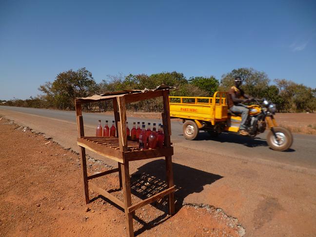 Abendstimmung Cocolou Canyon 07.01.2013 auf der strasse nach südenEine Etappe, von der ich nicht weiss, wo sie enden wird. Frueh am Morgen breche ich auf. Kurz nach sieben Uhr am Ortsausgang von Mali brennt ein Mann sein Grundstueck ab. Kein Grund zur Sorge sondern landestypisches Verhalten. Die Kilometerangaben sind mal wieder unpraezise, so dass ich Pellalh, einen Ort, den man mir zum Uebernachten empfohlen hatte, verpasse. Ein paar Maenner unter einem grossen schattenspendenden Baum, eroeffnen mir, dass ich bereits sieben Kilometer zu weit bin. Zurueck moechte ich nicht. Kommt da noch etwas, wo ich uebernachten kann? In 16 Kilometern, sei ein Ort namens Sara Kali. Das passt mir gut von der Entfernung, so dass ich weiterradele. Ein paar Unterstaende und ein paar Frauen, die Orangen verkaufen, markieren diesen Ort. Ein Mann ist bereit, mich bei sich zelten zu lassen, aber er ist irgendwie noch beschaeftigt an der Strasse und wartet auf eine Lieferung. Er bittet mich auf einer niedere Bank ohne Rueckenlehne Platz zu nehmen, wo bereits einige Maenner sitzen. Dort verbringe ich nun die naechsten vier Stunden. Waehrend ich dort sitze, bekomme ich vier oder fuenf africanische Tees zu trinken, ansonsten beobachte ich den spaerlichen Verkehr. Alle Viertelstunde kommt etwas angerollt. Ein Motorrad, dessen Schopperartiger Lenker es von den sonst ueblichen Strassenmodellen chinesischer Bauart unterscheidet, erregt mein Interesse. Der Fahrer traegt ein Gewehr vor der Brust und olivgruene Gummistiefel, dazu auf dem Kopf ein Wollmuetze, auf der eine vollverspiegelte Sonnenbrille steckt. Auf dem Sozius hat er zwei grosse Saecke, vermutlich Orangen oder Kartoffeln, geladen auf denen oben drauf drei Huehner festgeklemmt sind. Ein guineischer Raeuber Hotzenplotz. Die seltenen Buschtaxis, faelschlicherweise oft als "sept place" bezeichnet, sind voellig ueberladen. Hoehepunkt ist ein Sandwich a la Fouta Djalon. Ein mindestens 30 Jahre alter Peugeot-Kombi, in dessen Inneres sich 11 oder 12 Personen hineingezwaengt haben, waehrend auf dem Dach etwa zwei Meter hoch Saecke und Taschen festgeschnallt sind, worauf wiederum acht oder neun Maenner sitzen, schaukelt gemaechlich vorueber. Peugeot muss einmal robuste Autos gebaut haben. Als es schon dunkel ist folge ich meinem Gastgeber zu einem gemauerten und ordentlich verputztem Haus. Dort bekomme ich in einem Vorraum, der auch als Garage fuer sein Motorrad und mein Fahrrad dient, ein breites Bett aus Bambus zugewiesen. Erschoepft, eingestaubt, verschwitzt und dreckig sinke ich darauf nieder. Da er eine von mir angebotene Bezahlung ablehnt, schenke ich jedem seiner fuenf Soehne einen Kuli und einen aufgeblasenen Luftballon. Meine unfreiwillige Gegenleistung besteht in zwei Stunden Babysitting, denn von nun an tollen drei der Jungs mit den Luftballons durchs Zimmer und reden wild auf mich in Fula ein, wobei es sie nicht im geringsten stoert, dass ich kein Wort verstehe und nicht antworten kann. Der Vater hatte mir zwar angeboten, die Tuere zu schliessen, falls ich meine Ruhe haben moechte, aber ich will den Jungs nicht den Spass verderben.