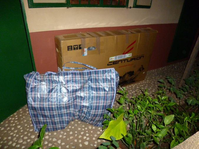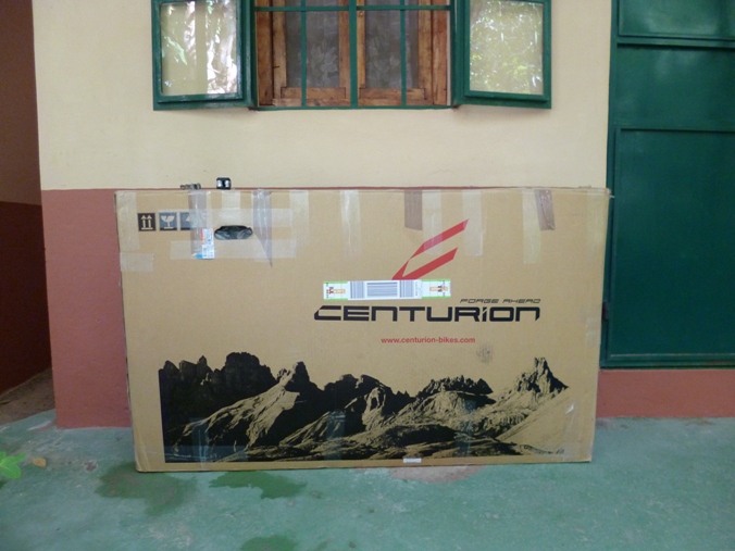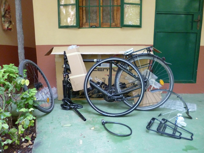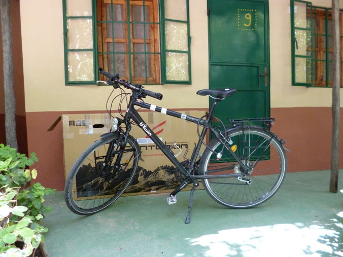 auf mein Fahrrad dessen Verpackung am Vortag fast gescheitert waere. Von einem lokalen Fahrradhaendler