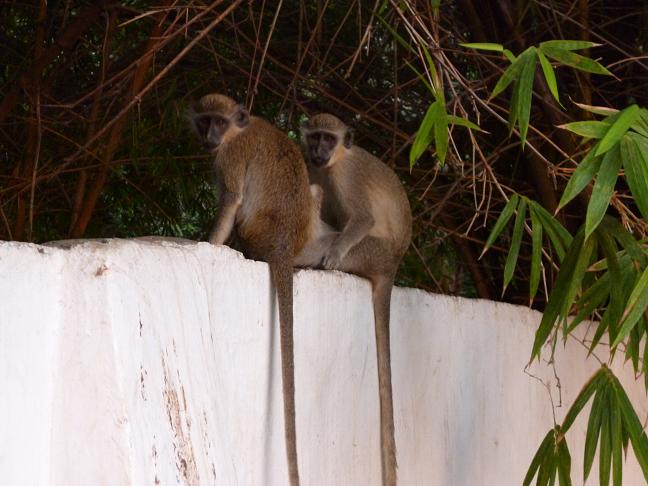 Meine Gastfamilie in Fatoto. Amadou arbeitet schon, links seine Mutter und rechts seine Frau 13.12.2012 affenhordeEine weitere Radetappe brachte mich nach JangJang Bureh, einen Ort der seitdem Ende der Kolonialzeit in einen Dornroeschenschlaf gefallen ist. Erlebenswert ist nicht der Ort selbst sondern das gleichnamige Dschungelcamp, das geruechteweise einem deutschen gehoert, doch die wahren Herren dieses wunderbaren Fleckens sind die Affen. Ueberall springen sie herum, jagen sich, hangeln sich durch die Baeumebalgen sich wie kleine Kinder und wer nicht aufpasst, dem klauen sie das Fruehstueck. Fuenf Tage verbrachte ich an diesem herrlichen Ort inklusive einer ganztaegigen Bootsfahrt auf dem Gambiafluss mit phantastischer Wildniss entlang der Ufer.